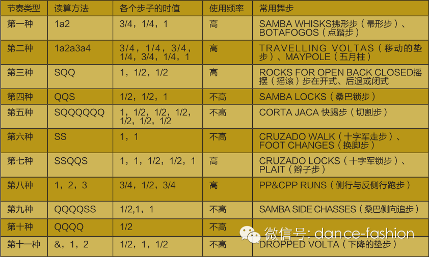 桑巴舞的音乐节奏为 2/4 拍,其强拍落在每个小结的第二拍,速度为每分钟 50 小节左右。在桑巴舞中,许多舞步的节拍切分方法差别较大,一些较常用的舞步的步伐算法及其各步的节拍时值可参考下面的图表: