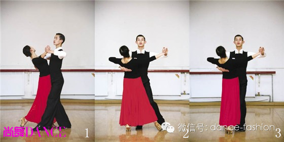 如图1—6所示,从女生后退的图中我们可以看出重心始终在垂直的位置中,为了保持良好的跟随和整体的平衡,此时女生的身体虽然是向后移动的,但是其脊椎的力量仍然和舞伴保持着很好的合力关系。倘若此时女生将上身的力量过多的向后倒,势必导致身体失去平衡,而手臂的力量一定会向后拉动男生,从而定将破坏彼此的平衡关系,令人遗憾的是这种错误在比赛中屡见不鲜。