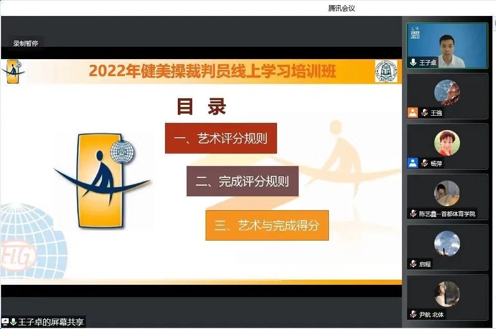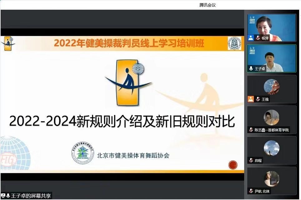 本次培训选择在腾讯会议里进行线上云课程培训,新颖的培训方式在疫情常态化工作方针的前提下,充分发挥师生安全互动的功能,极大地鼓励了健美操裁判员和有意向提高人员的参与热情。协会健美操专项委员会主任国际级裁判杨萍教授主持了本次培训,鼓励健美操裁判员们要与时俱进,不断接受新的理念,夯实专业技能,积累执裁经验,为北京健美操事业不断扩充优质的裁判队伍,促进健美操项目的有序健康发展。